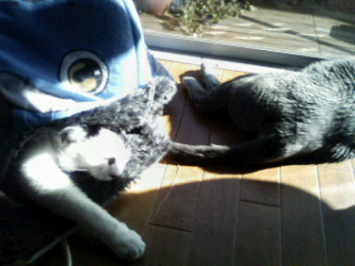 窓際の日向で完全にぐうたらな二人です。 左側の花梨は特製の魚ベッドに入ってます。ちなみにこのベッドの下には猫用の暖房マット(ホットカーペットの小さいような奴)が仕込まれてまして、冬には一番心地よい場所です。が、日中日差しがある時は日光浴もしたいと思ったのか身体を少し出して、このぐうたらポーズになっている訳です。 猫が羨ましい...