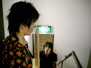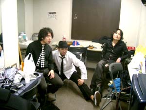 そんなこんなで、写真はライブ前の楽屋にて。 平井さんがカッコイイですねー。 個人的には、「朝焼けの旅路」がセットリスト1曲目バージョン時のドラムINのフィルが旬でございます。 皆様、是非2008年にチェックしてください!!