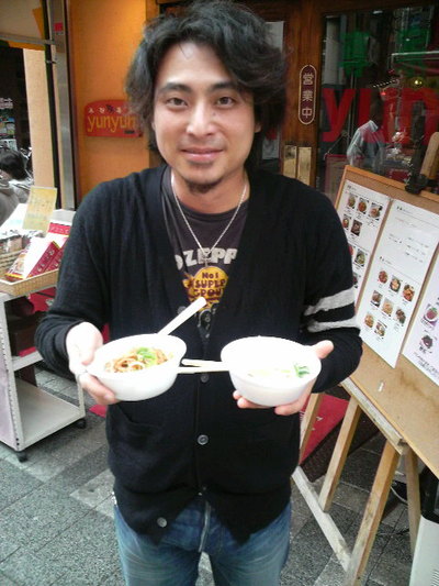 モトキチ食べ歩き隊隊長なにも考えず二品いっぺんに頼んでしまい、両手にメシ♪